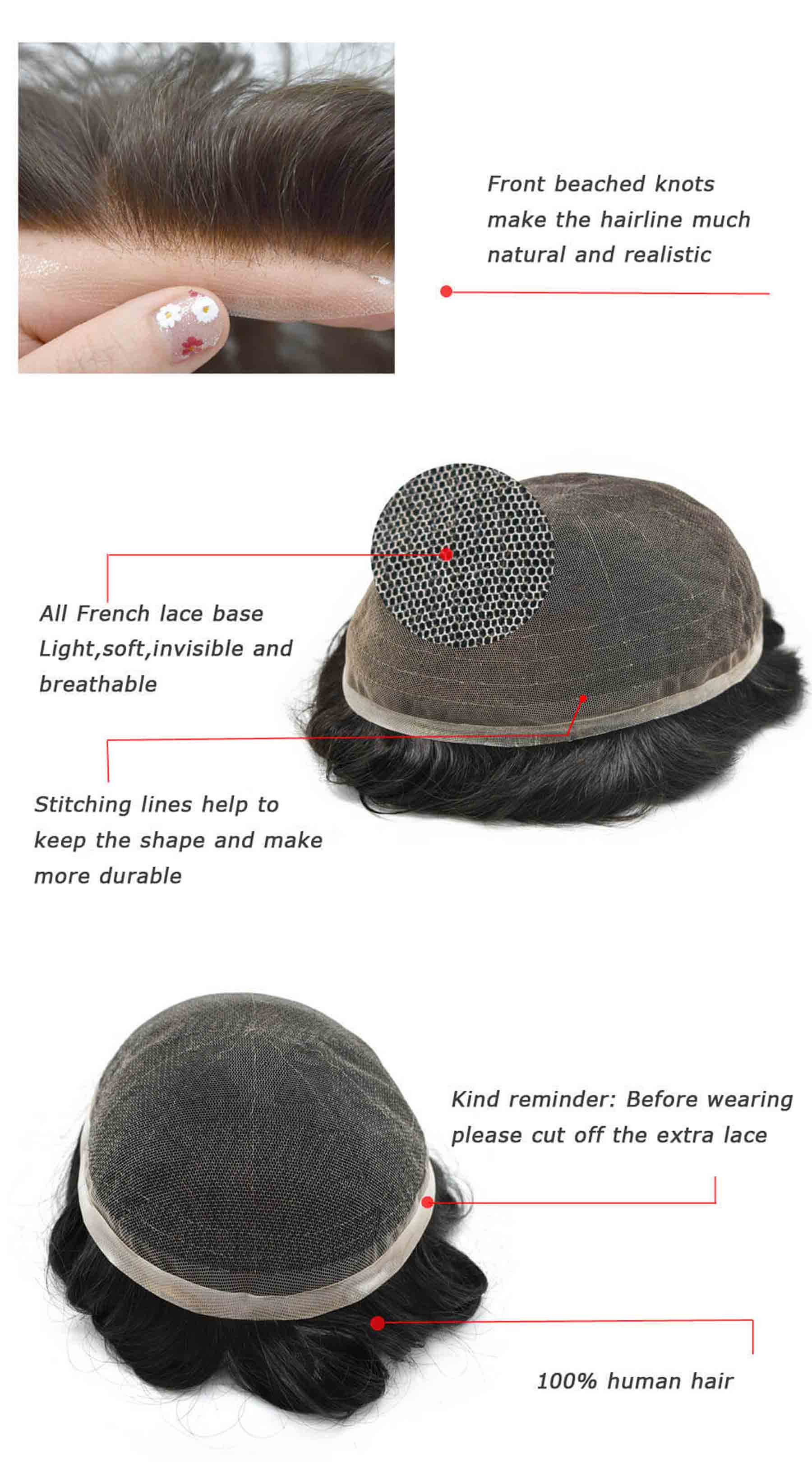 Our hair replacement is 100% hand-tied, easy wearing, soft and smooth, comfortable feel, natural-looking. We have various kinds of base designs. Our significant base designs are such as Monofilament base systems, All French/Swiss lace systems, Thin Skin base systems, Lace Front systems, as so on.